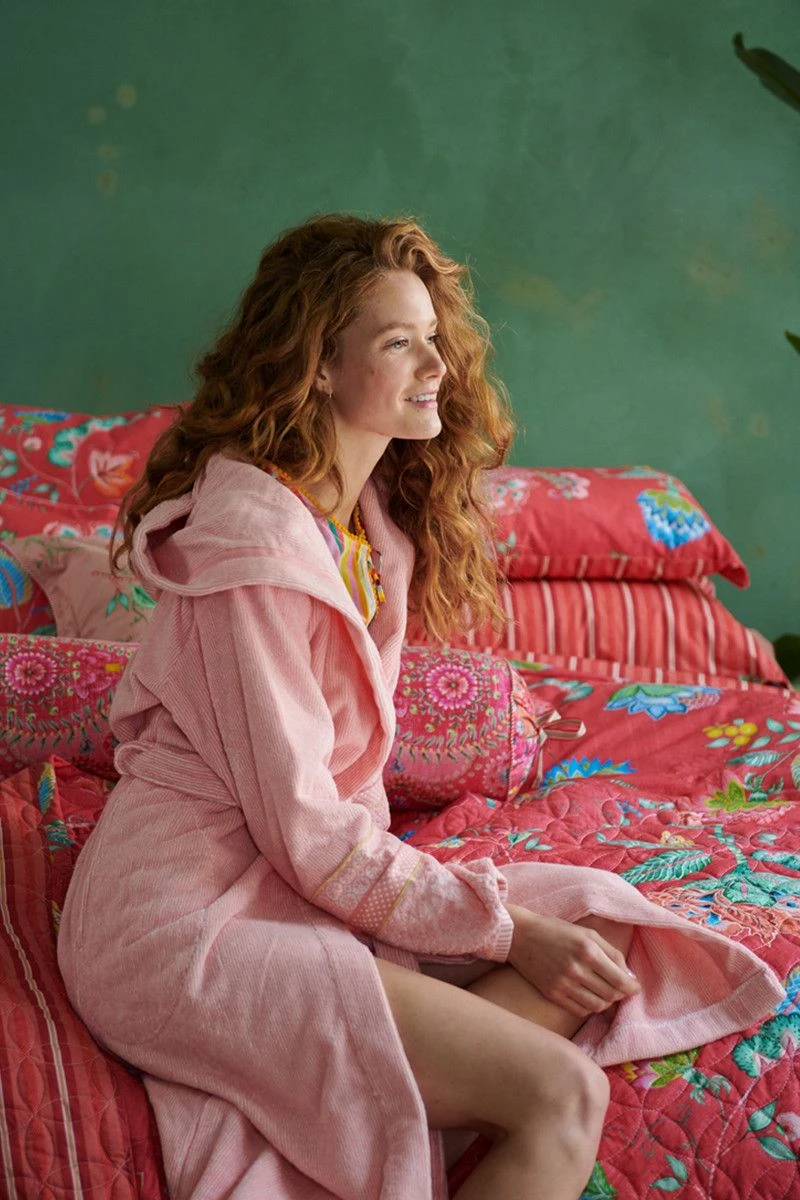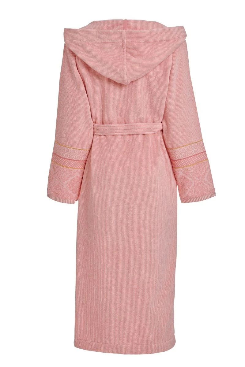 This long pink bathrobe with fine stripes is from the Soft Zellige collection. The sleeves are finished with pink and yellow piping and a jacquard pattern. The bathrobe has side pockets and a hood. The bathrobe should be washed before use according to the care label.