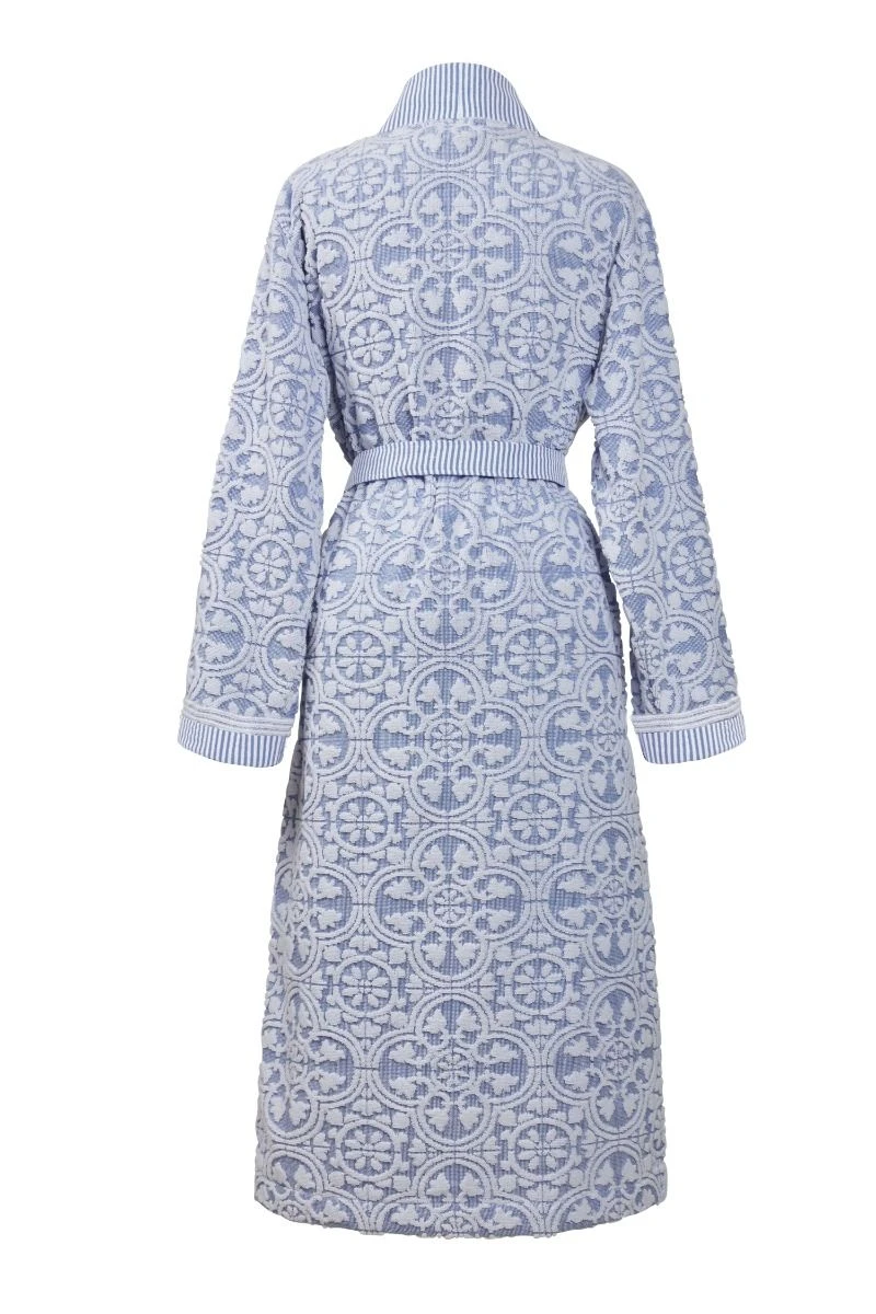 This blue Tile de Pip bathrobe is great to wear in the morning or at the end of the day. Decorated with a tonal, woven tile print with high-low effect. The bathrobe has a stitched collar, slit pockets, and a long belt. The bathrobe is made from 100% high-quality cotton terry velour with a quality of 380 gr/m2.