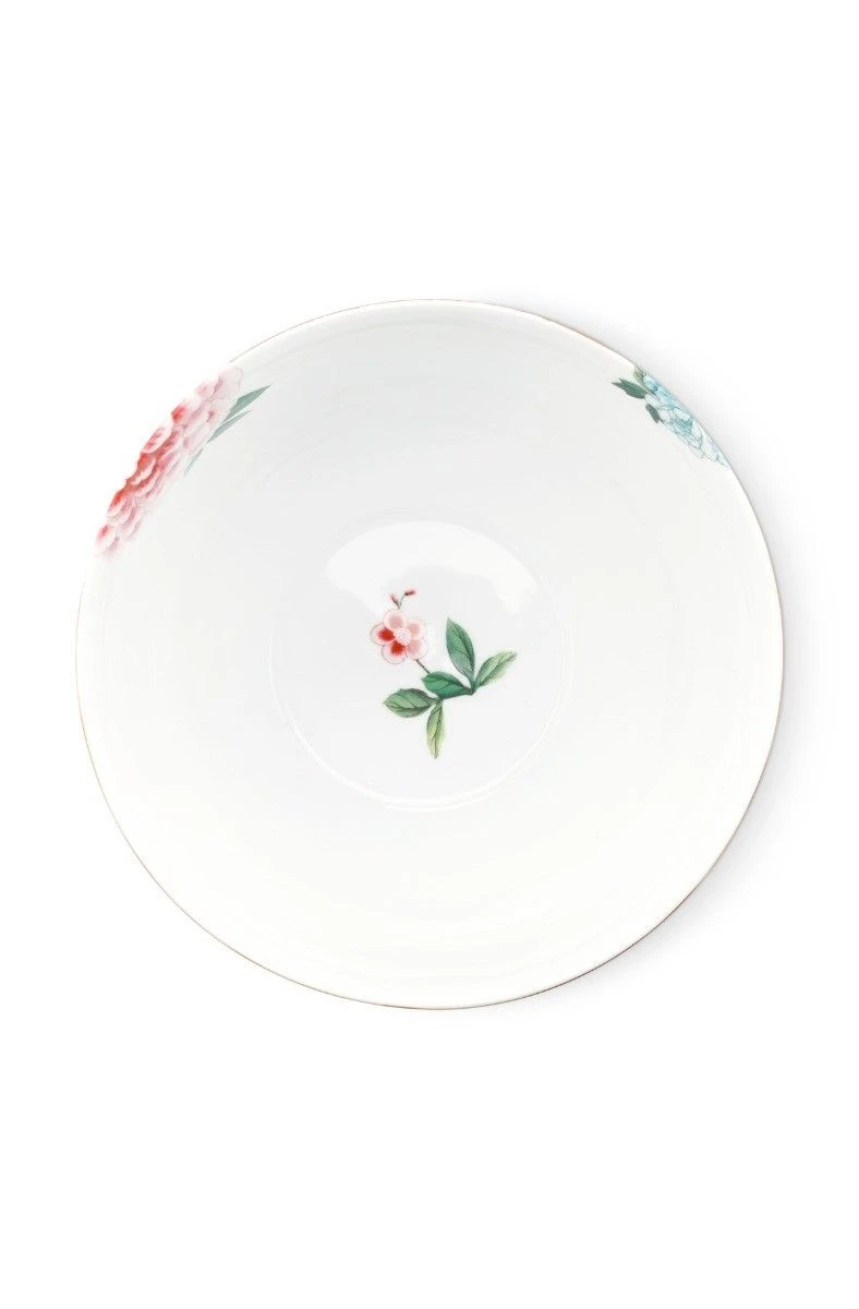 This large bowl is decorated all around with exotic flowers and birds, golden details and a butterfly. The background has an elegant print and elements from the design adorn the inside of the bowl. Combines beautifully with the other porcelain sets in the Blushing Birds collection.
