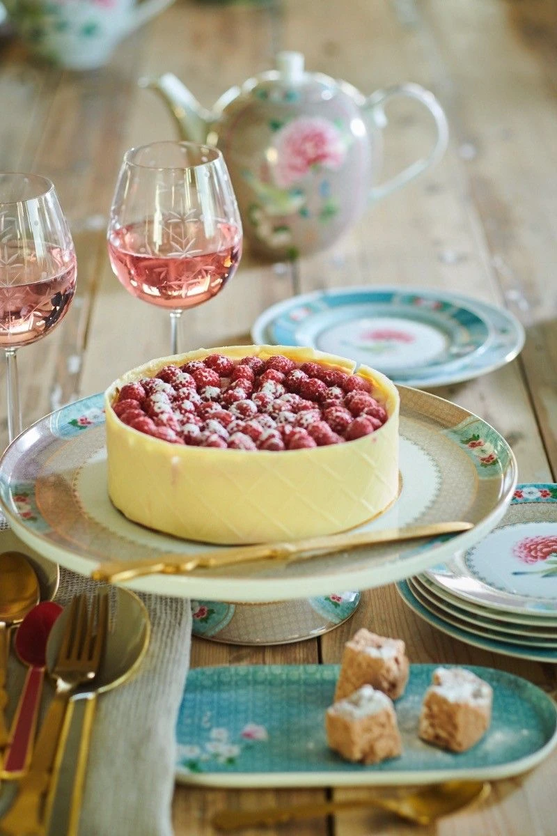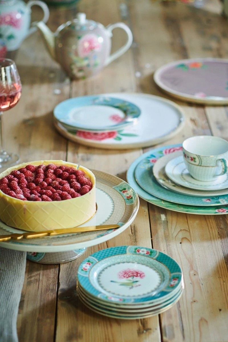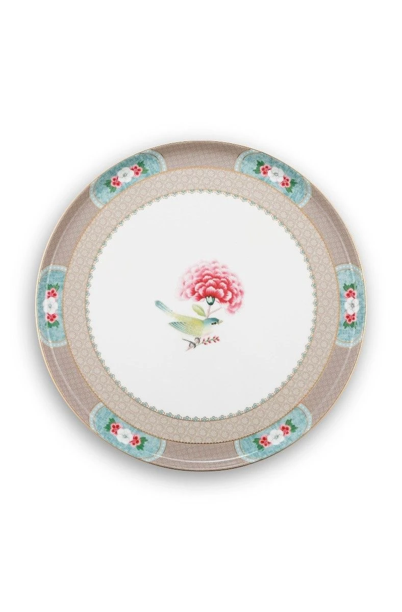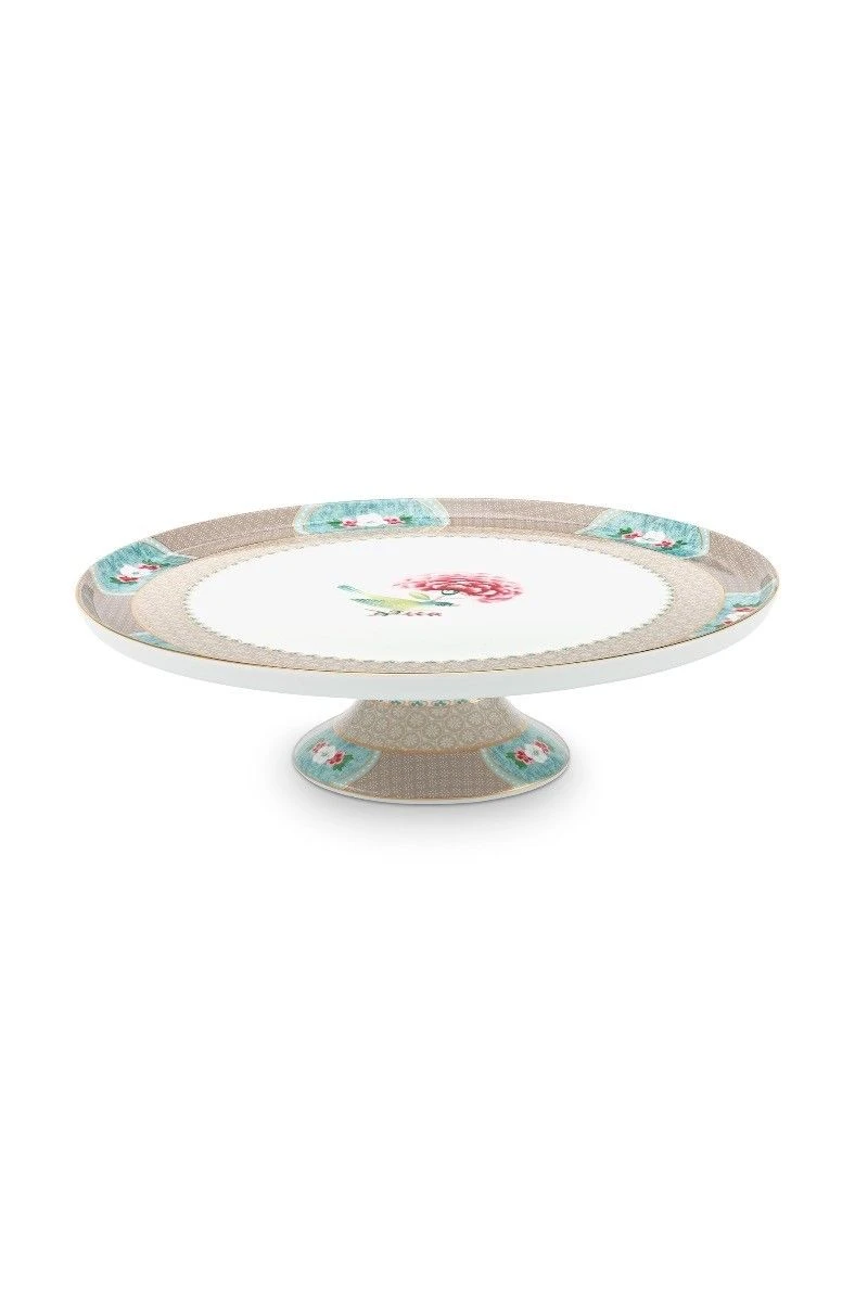Both the plate and base of this small khaki round cake tray are decorated with an elegant design, exotic flowers and golden details. Combines beautifully with the pastry plates and coffee and tea porcelain sets in the Blushing Birds collection.