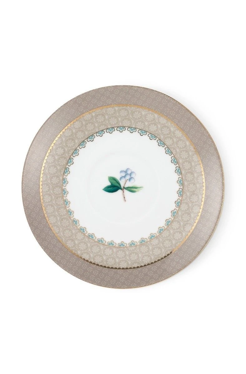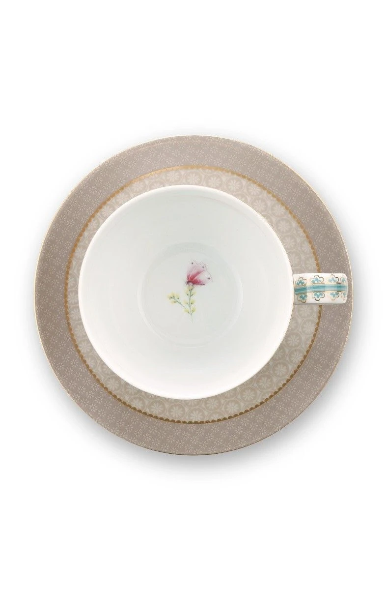 This khaki cappuccino cup and saucer set is decorated with a khaki design, exotic flowers and golden details. Combines beautifully with the other coffee sets in the Blushing Birds collection.