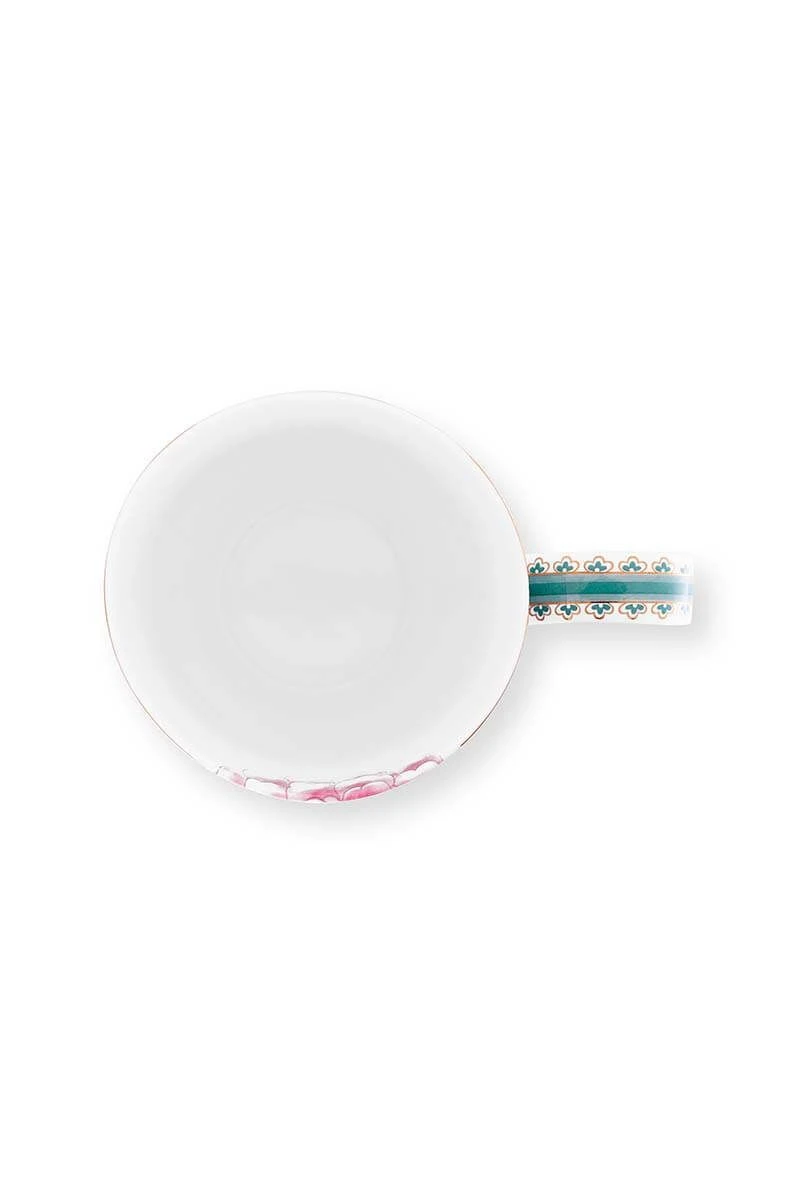 This blue porcelain mug is decorated all around with exotic flowers, a bird and golden details. The large pink flower extends slightly over the edge and the background has an elegant design. Combines beautifully with the other porcelain products in the Blushing Birds collection.