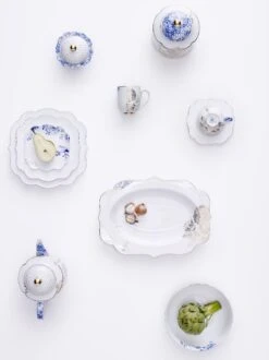 This blue espresso cup and saucer set is decorated with a blue design and golden details. The handle is adorned with pink and golden elements and exotic flowers decorate the saucer. Combines beautifully with the other coffee sets in the Blushing Birds collection.