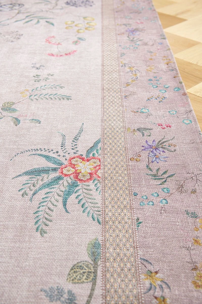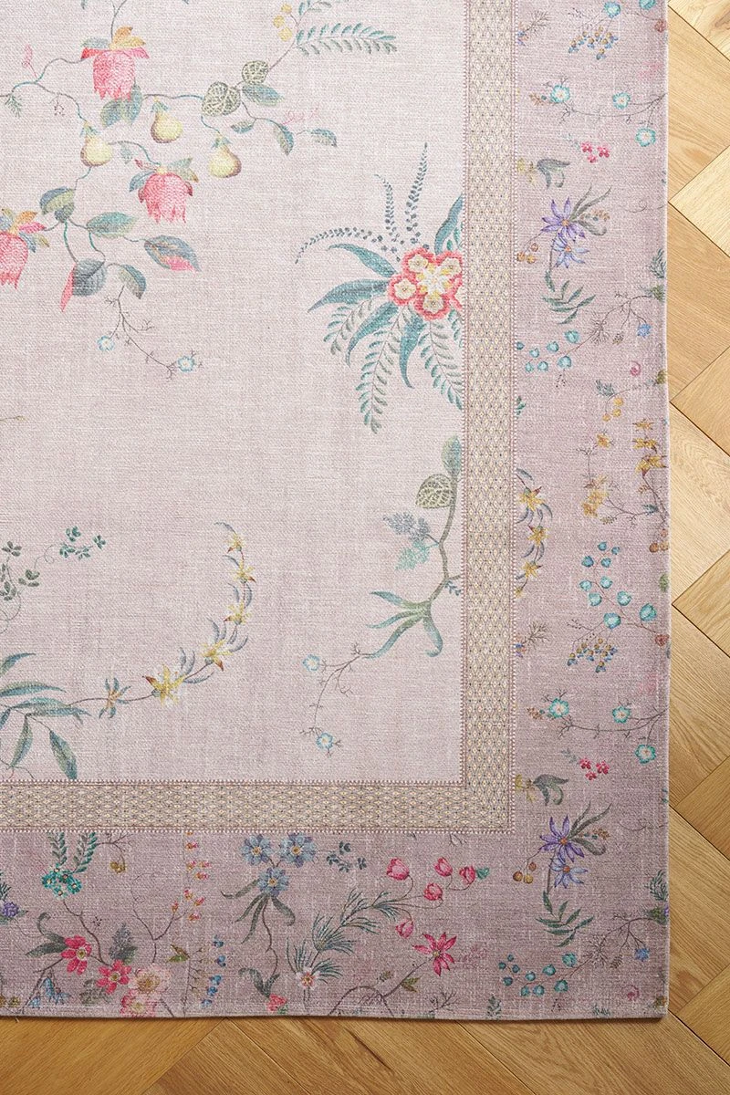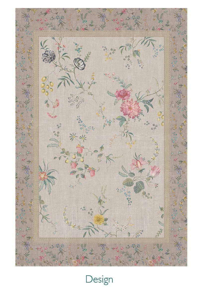 The khaki Fleur Grandeur by Pip carpet with border has a wonderfully fresh-looking design. The design of this Fleur Grandeur by Pip carpet with border consists of fanciful flowers and elegant flower branches with Dahlias, fresh blue cornflowers and a scattering of summer fruits. The pastel soft, light colours in this colourful design gives this carpet an extra luxurious look. The carpet is decorated all around with a beautiful khaki border en due to the soft and cheerful colours it is a refreshing item in your interior. The rug is printed and can be combined in many interior designs. In addition to the colour green, the Fleur Grandeur by Pip carpet is also available in blue/khaki, green and pink. Which colour will you choose?