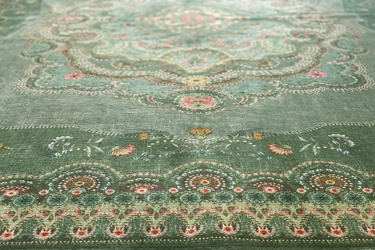The Majorelle collection has been expanded with a beautiful carpet in the colour green. Colourful flowers on a softly coloured background give this carpet a vintage look with a contemporary twist. The carpet is perfect to use to style the living room or bedroom.