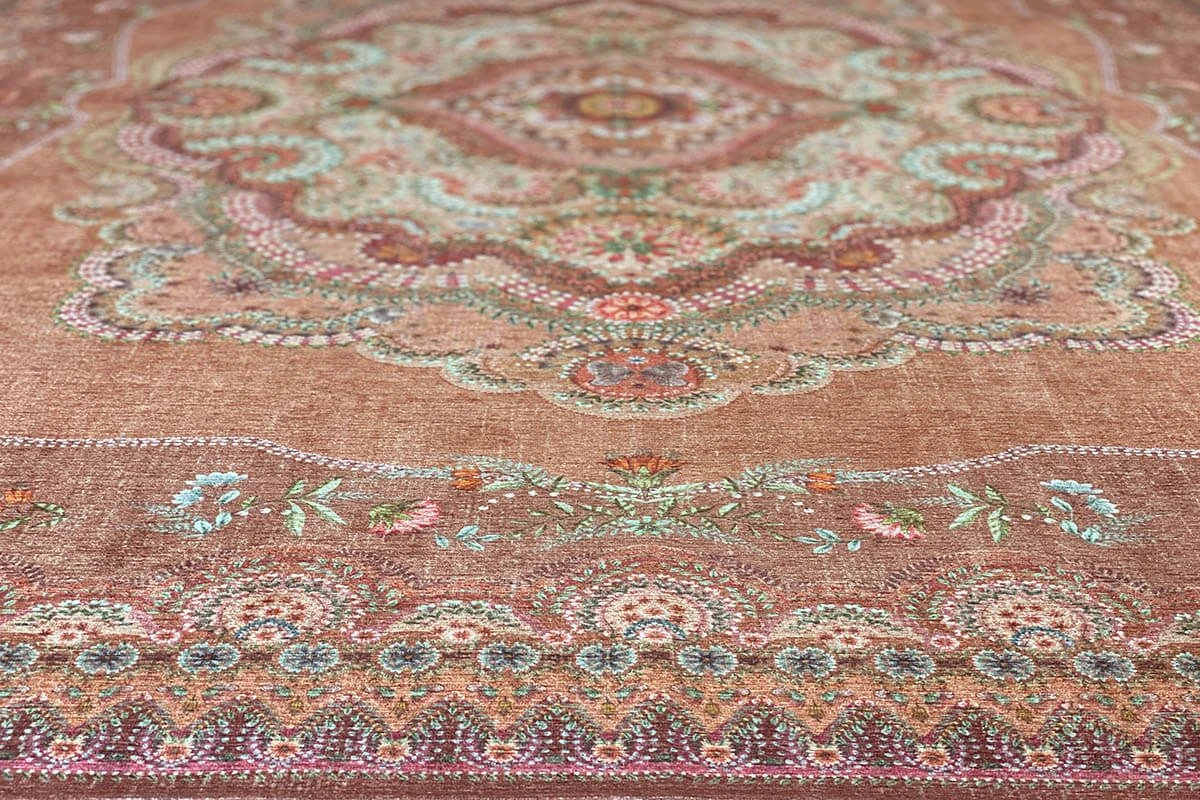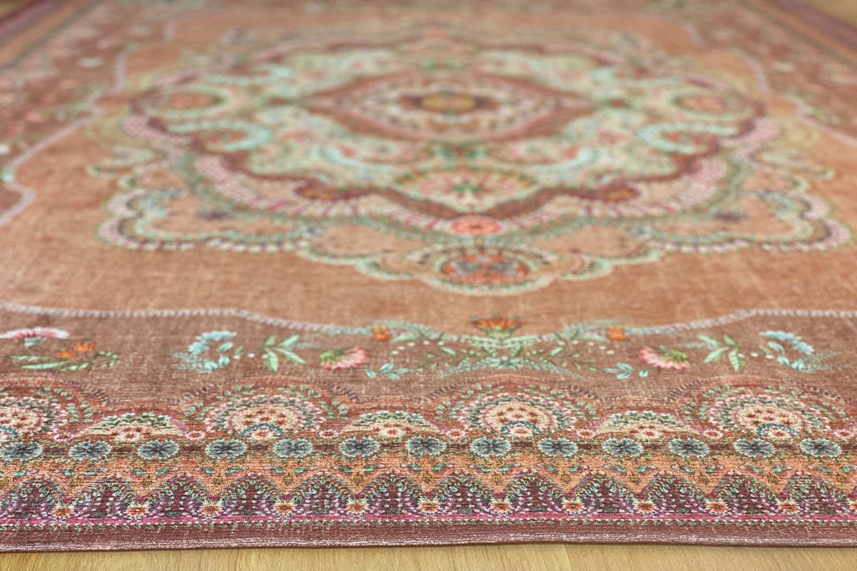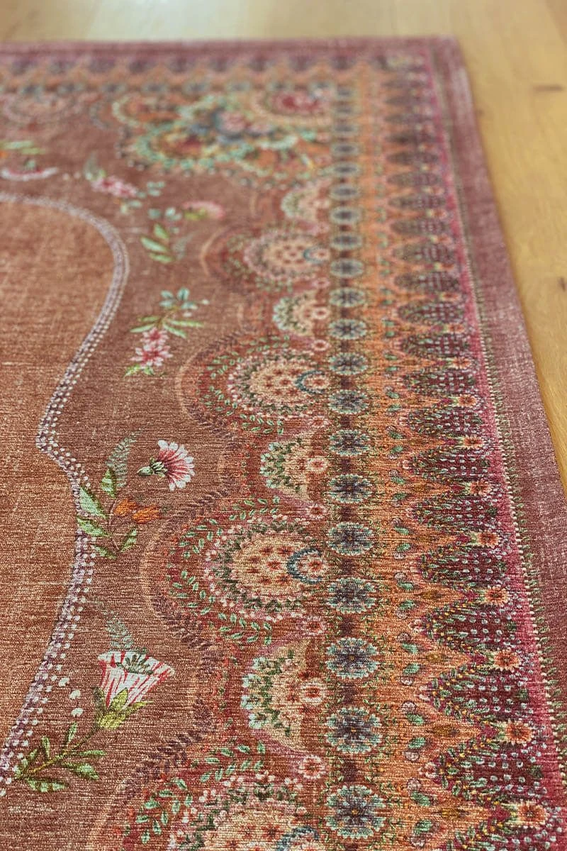 The Majorelle collection has been expanded with a beautiful carpet in the colour terra. Colourful flowers on a softly coloured background give this carpet a vintage look with a contemporary twist. The carpet is perfect to use to style the living room or bedroom.