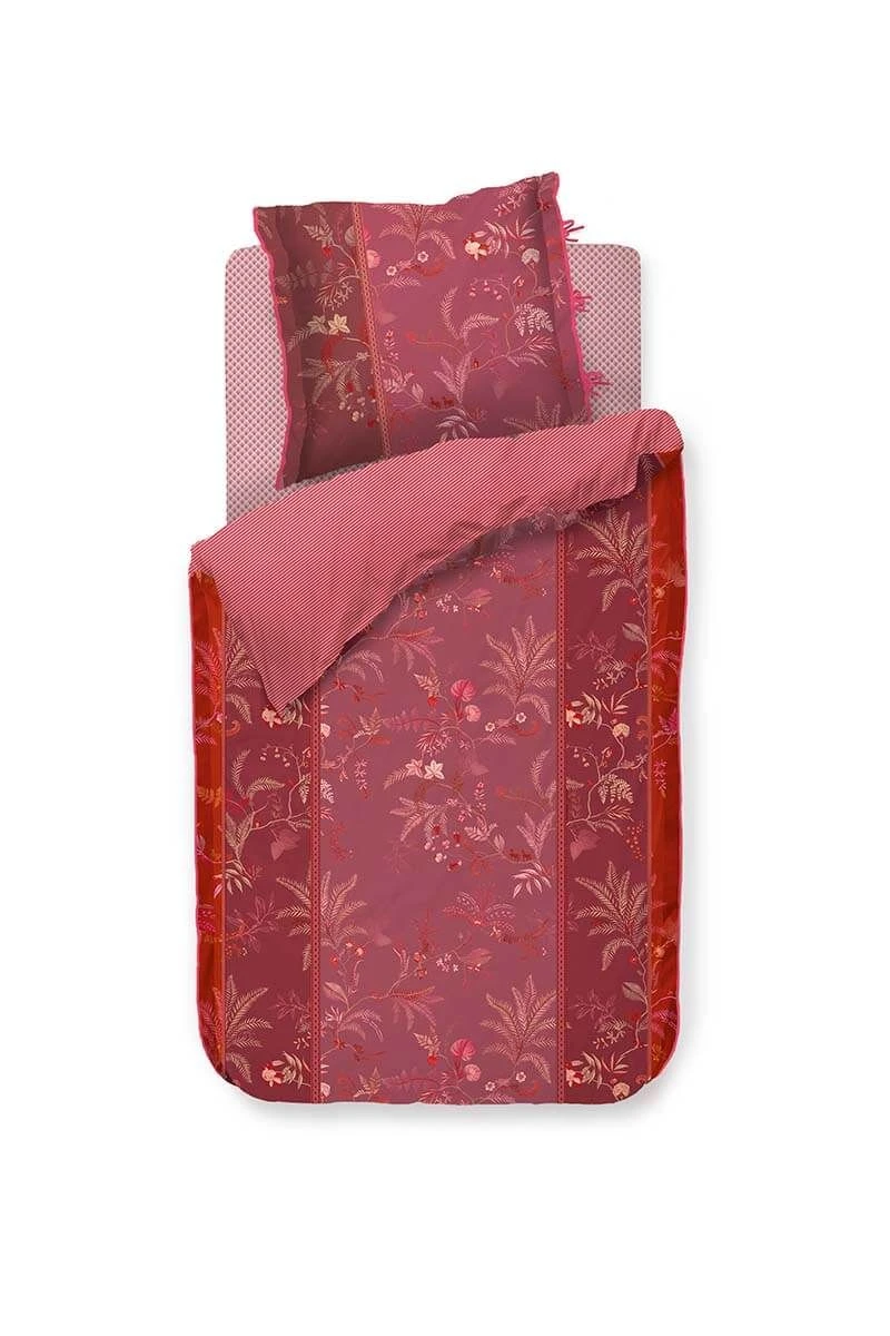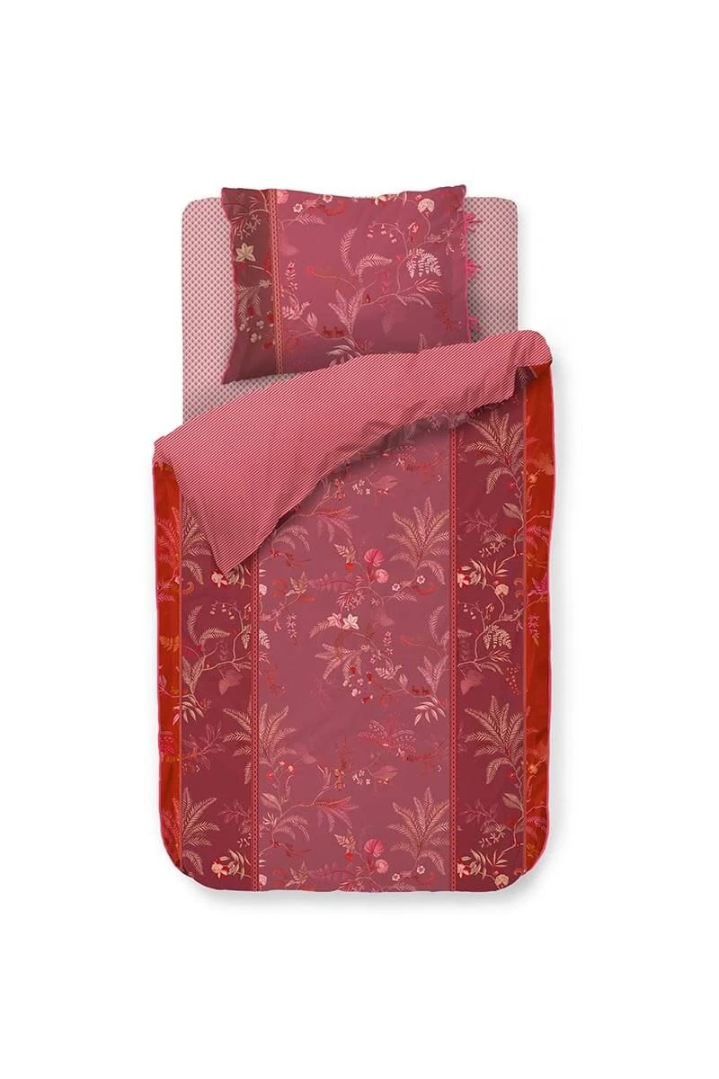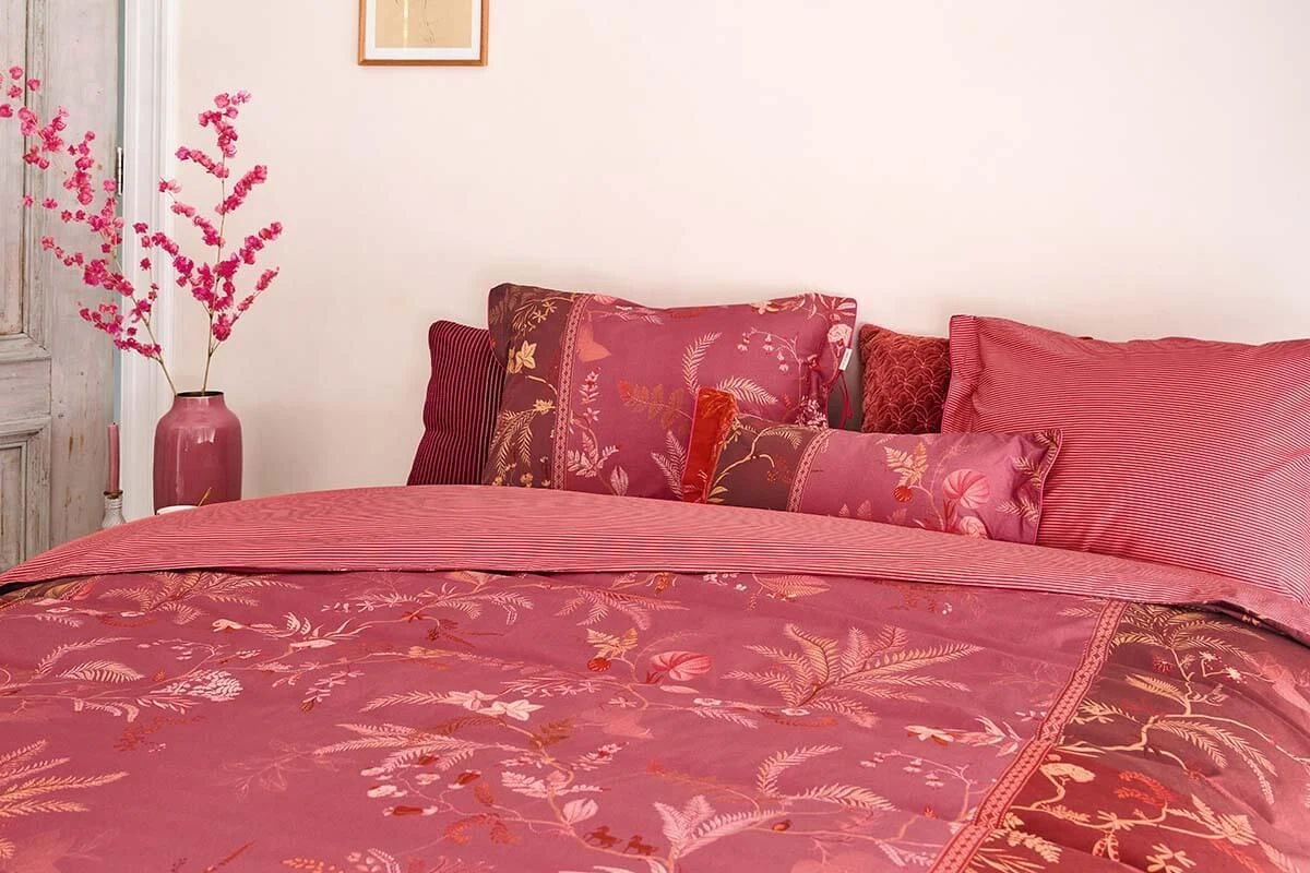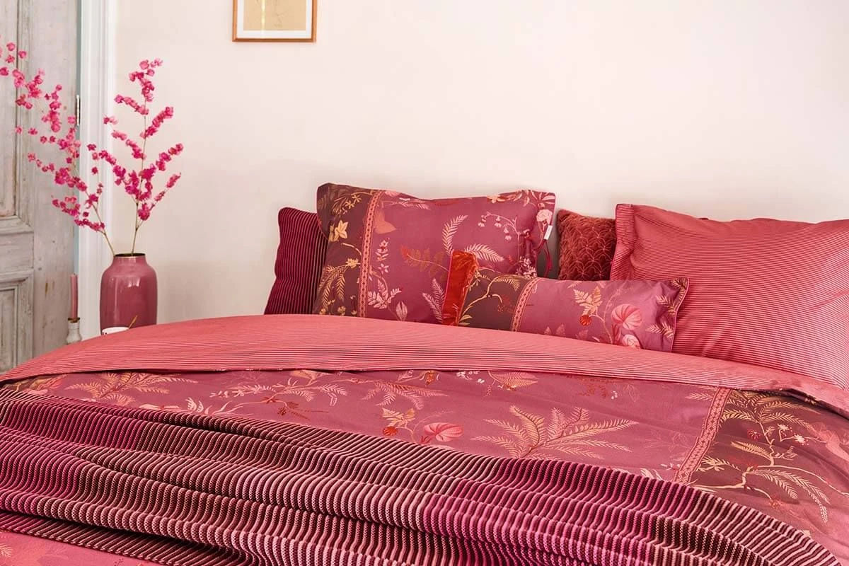 The pink Isola cover has a tonal print of detailed palm trees and ferns. The design has a distinct character due to the division into color bands. The cover and the cushions have a quilted oxford edge on the sides and are finished with a red and pink striped trim, which gives a luxurious look. The pillowcases have a tie closure and, just like the cover, have two different sides and can be used on both sides. This way you create a playful mix & match effect on your bed.