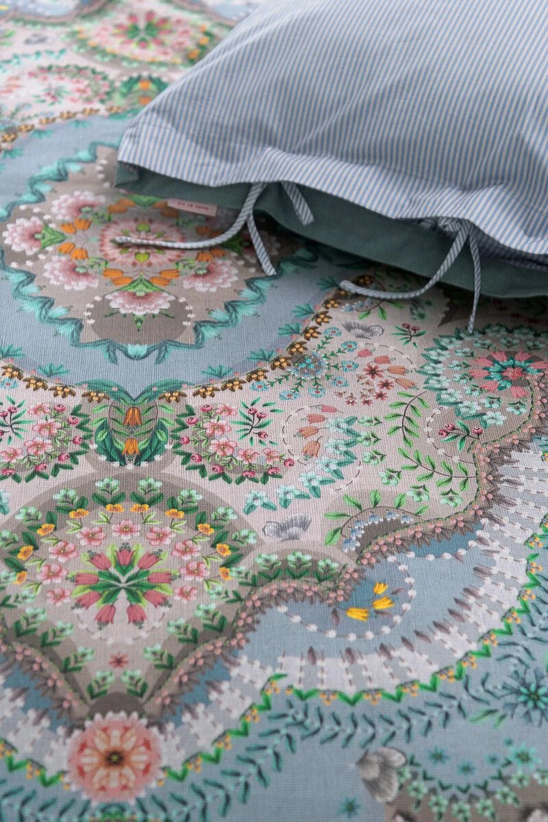 The unique Majorelle Carpet blue duvet cover is inspired by our classic carpets. The print is made up of thousands of small flowers in paisley-like shapes. Both the side panels and bottom flap have decorative strips of large flowers. The background has a subtle printed linen texture, giving the duvet cover the authentic look and feel of a woven carpet. A tonal horizontal stripe adorns the back.