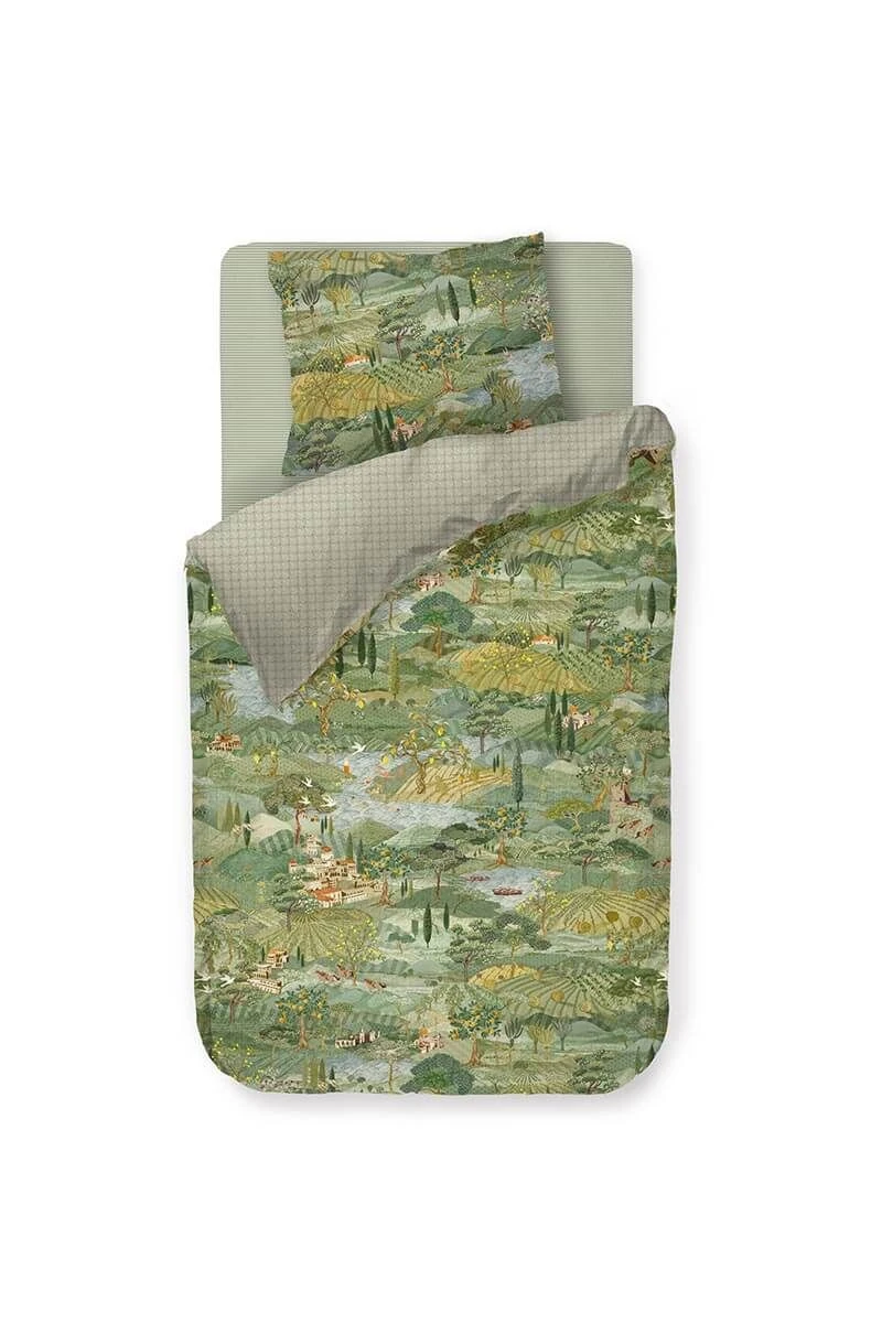 With the Toscana green duvet cover, you no longer need to take a vacation to Italy. The cypress trees and subtle references to Tuscan culture give you the feeling of being in the middle of the Italian countryside. The back has a pattern of shells. The cover and pillowcases have a quilted oxford border on the sides, giving a luxurious look. The pillowcases have an upholstered button closure and, just like the cover, two different sides and can be used on both sides. So you create a playful mix & match effect on your bed.