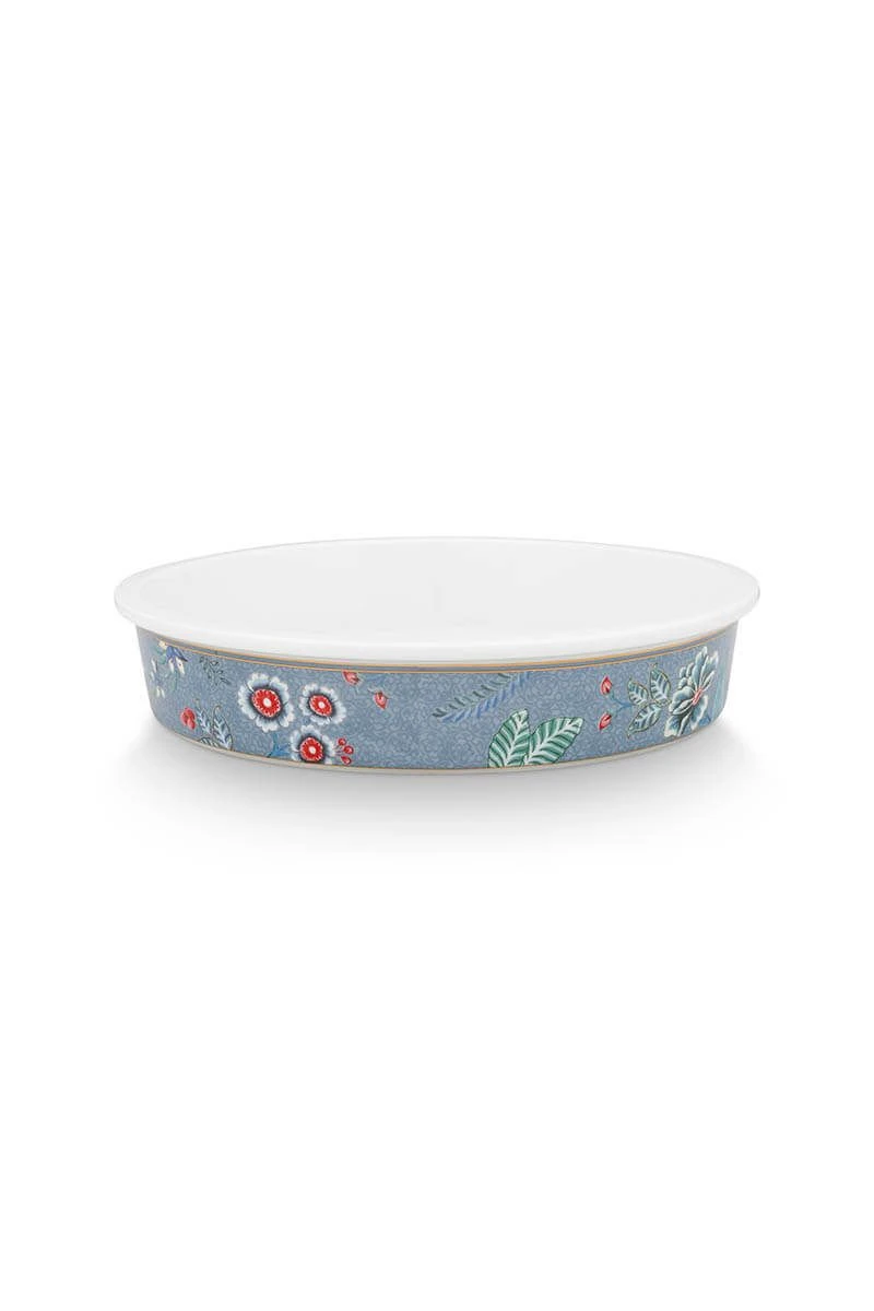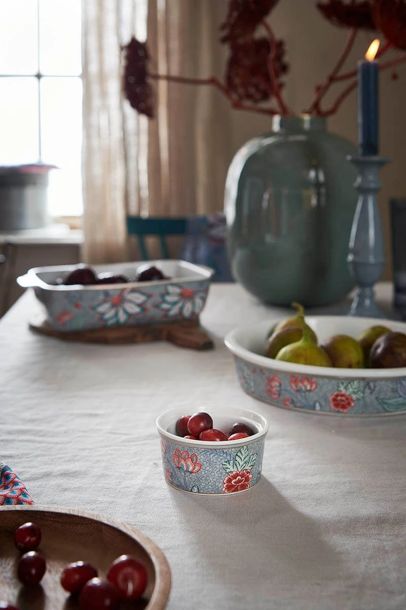 Bake your dishes in this cheerful baking dish from the Flower Festival collection . The baking dish has a floral design with imaginative red and pink chintz flowers with light blue and green leaves.