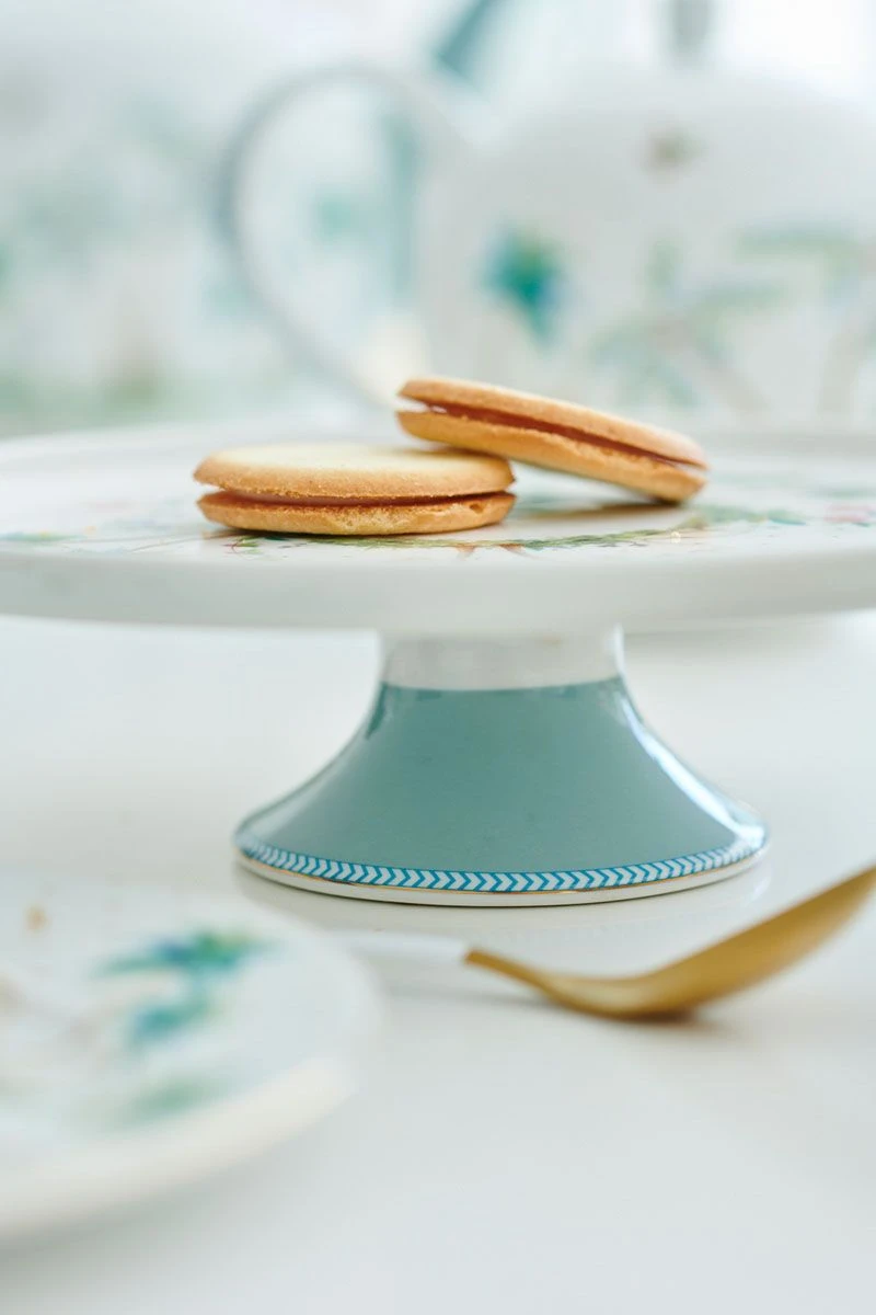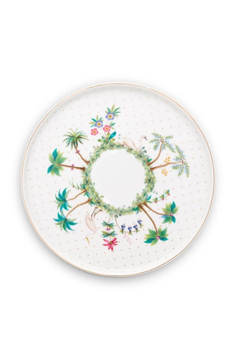 Use this cake tray at a high tea with friends to show a delicious cake. the base of this cake tray is blue and gives the tray an elegant look. The plate of this tray has a white backgorund with golden dots. Furthermore the cake tray will give you the feeling of a treasured island due to it’s design. in the centre you will find various plants, flowers and beautiful palms.