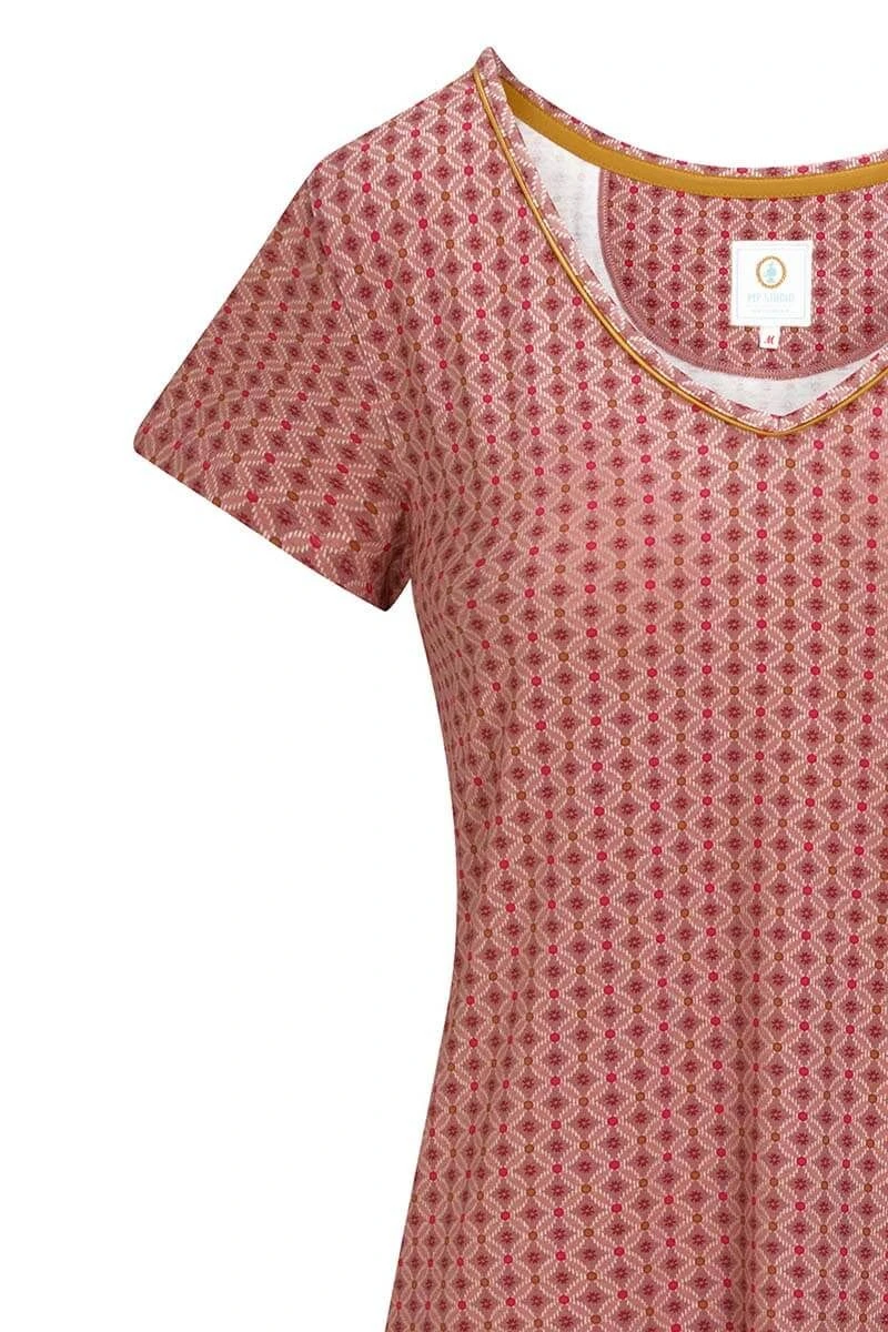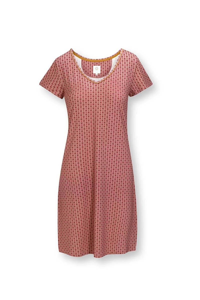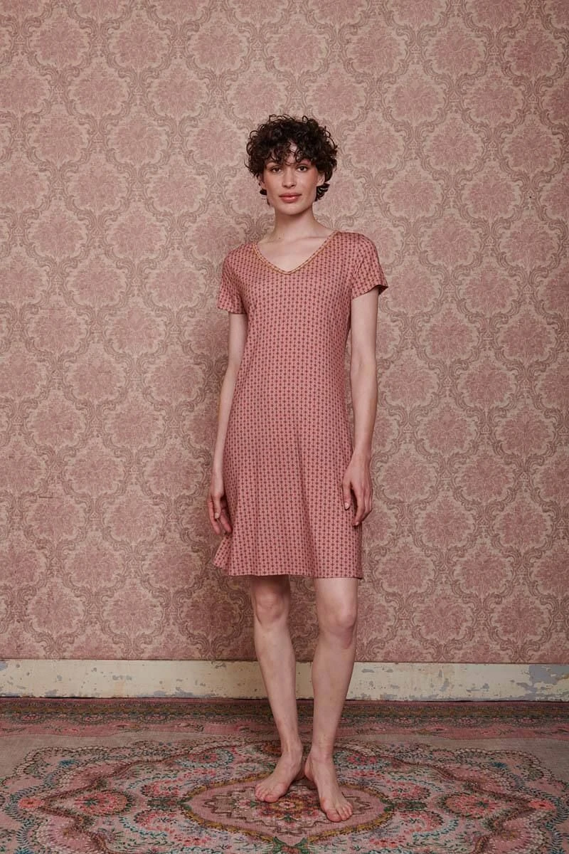 This blue nightdress is decorated with the organic Tegola design. The print consists of a variation of circles with a playful color difference. The nightdress has short sleeves.