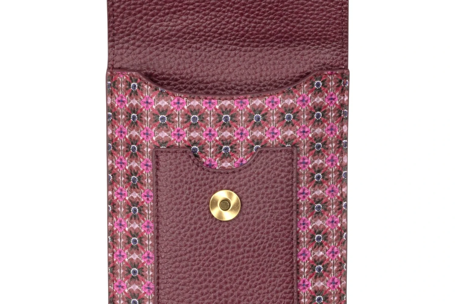 Take your phone with you in style with this pink phone bag from the Clover collection. The phone bag is decorated with a repeated design of stylized clovers and has enough space for a phone and your most important card.