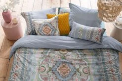 The pillow case has an Oxford edge and striped piping on the sides, as well as a unique tie closure in accent colours. A stylised geometric print adorns the back of the pillow case, so that both sides can be used. This provides a wonderful mix & match effect on your bed.