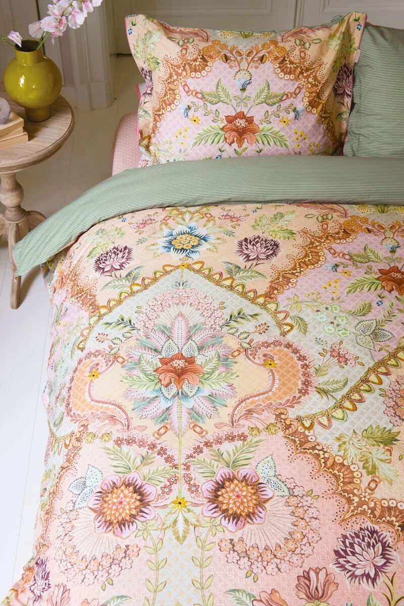 The pastel Saluti Grandi pillowcase is a symmetrically constructed floral pattern inspired by the beautiful wallpaper motifs of Italy. The back has a pattern of white and blue horizontal stripes. The pillowcase has a quilted oxford border on the sides, giving it a luxurious look. You can use the pillowcase on both sides.