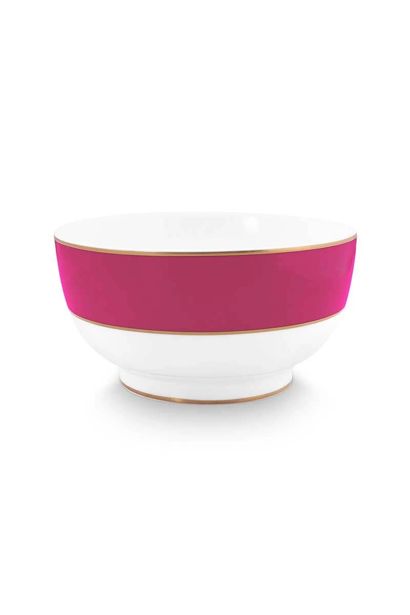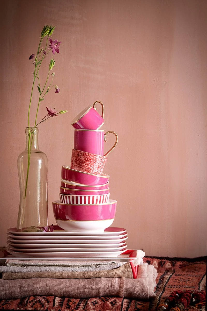This beautiful bowl has a pink background with golden details and is perfect to combine with the Royal Stripes collection. The Porcelain is made of bone China, a high-quality thin porcelain with a sophisticated design. Also available in sizes: 11.5 cm, 12.5 cm, 15.5 cm and 18 cm. Have a look at the full Pip Chique collection for more inspiration.
