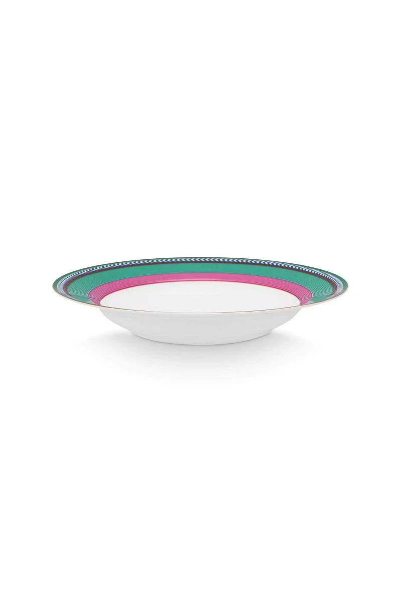 This deep plate has a pink and green striped design with a white background in the centre. The plate is finished with golden details and blue and white diamond shapes and perfect to mix with the other plates of this collection or our Royal Stripes collection. The Porcelain is made of bone China, a high-quality thin porcelain with a sophisticated design. Also available in sizes: 23.5 cm, and 28 cm. Have a look at the full Pip Chique Stripes collection for more inspiration.