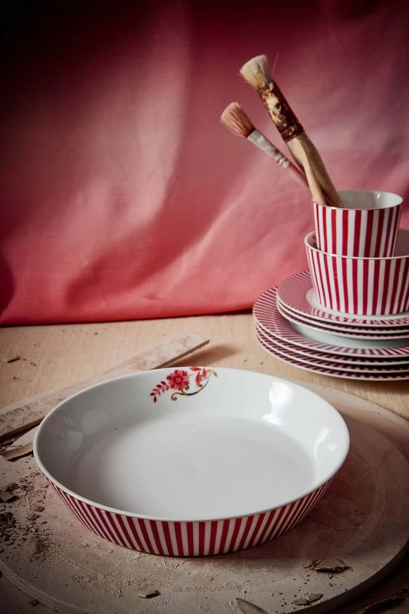 Looking for a deep plate to add to your tableware? This Royal Stripes deep plate matches perfectly with any design. You will find dark pink painted blossoms with golden details which give the plate an elegant twist. Mix & match this plate with other items of our Royal Stripes or Royal white and Multi colelction for a beautiful result.