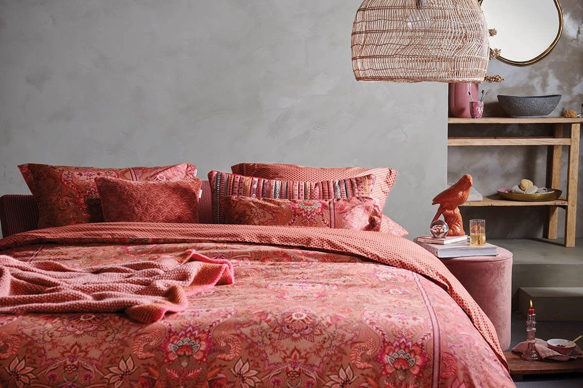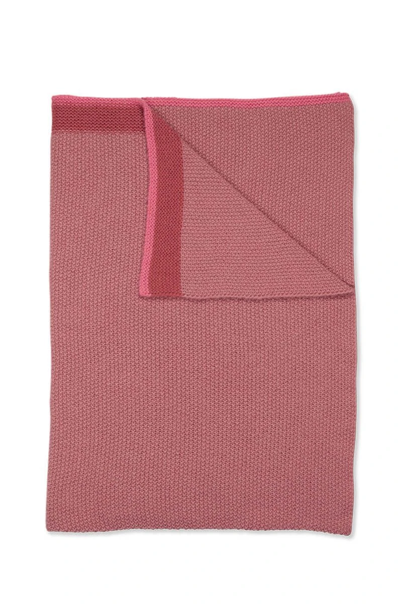 This pink crochet blanket is decorated with the Bonnuit design. This print is made up of a two-tone crochet pattern on the front and the same pattern in reverse colors on the back.