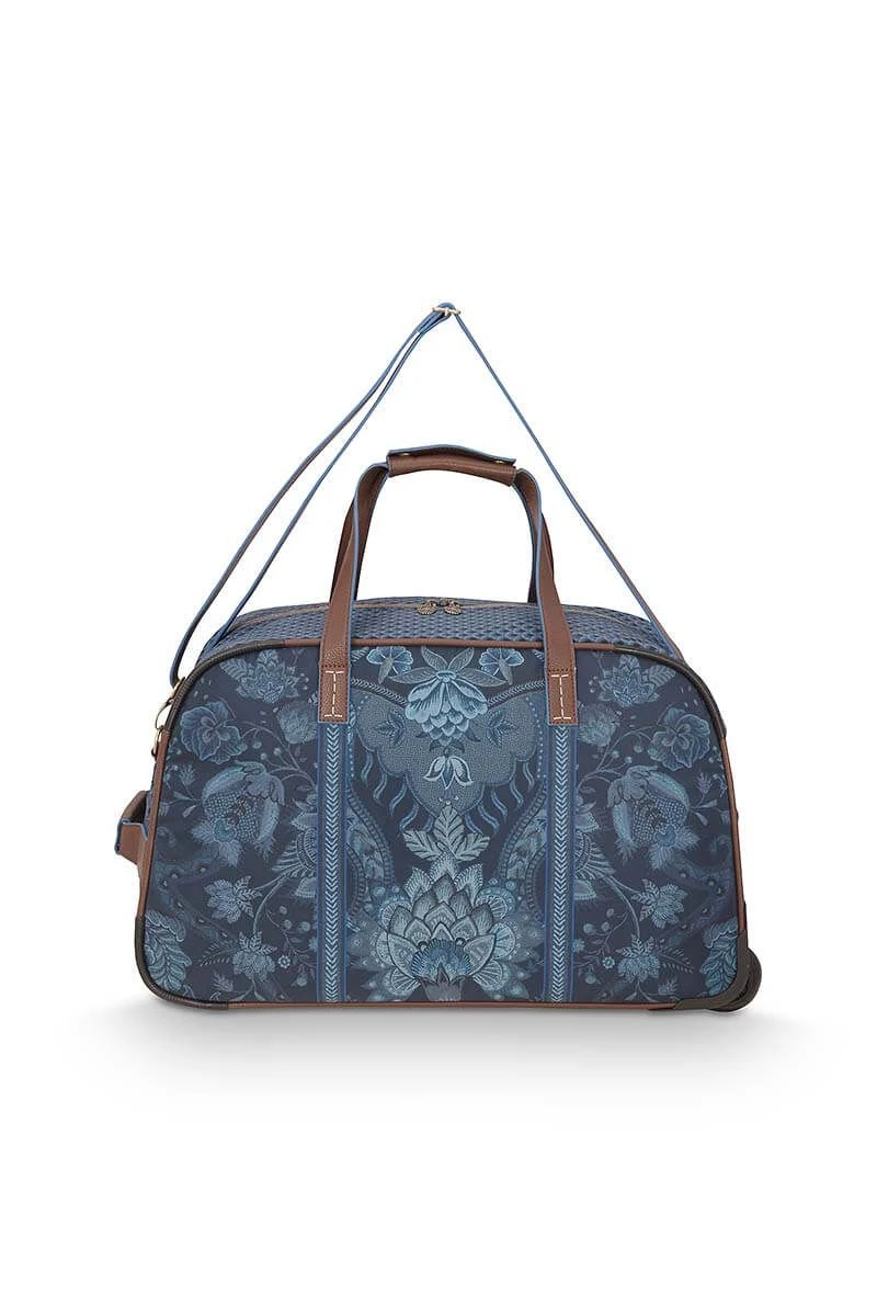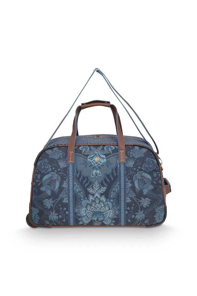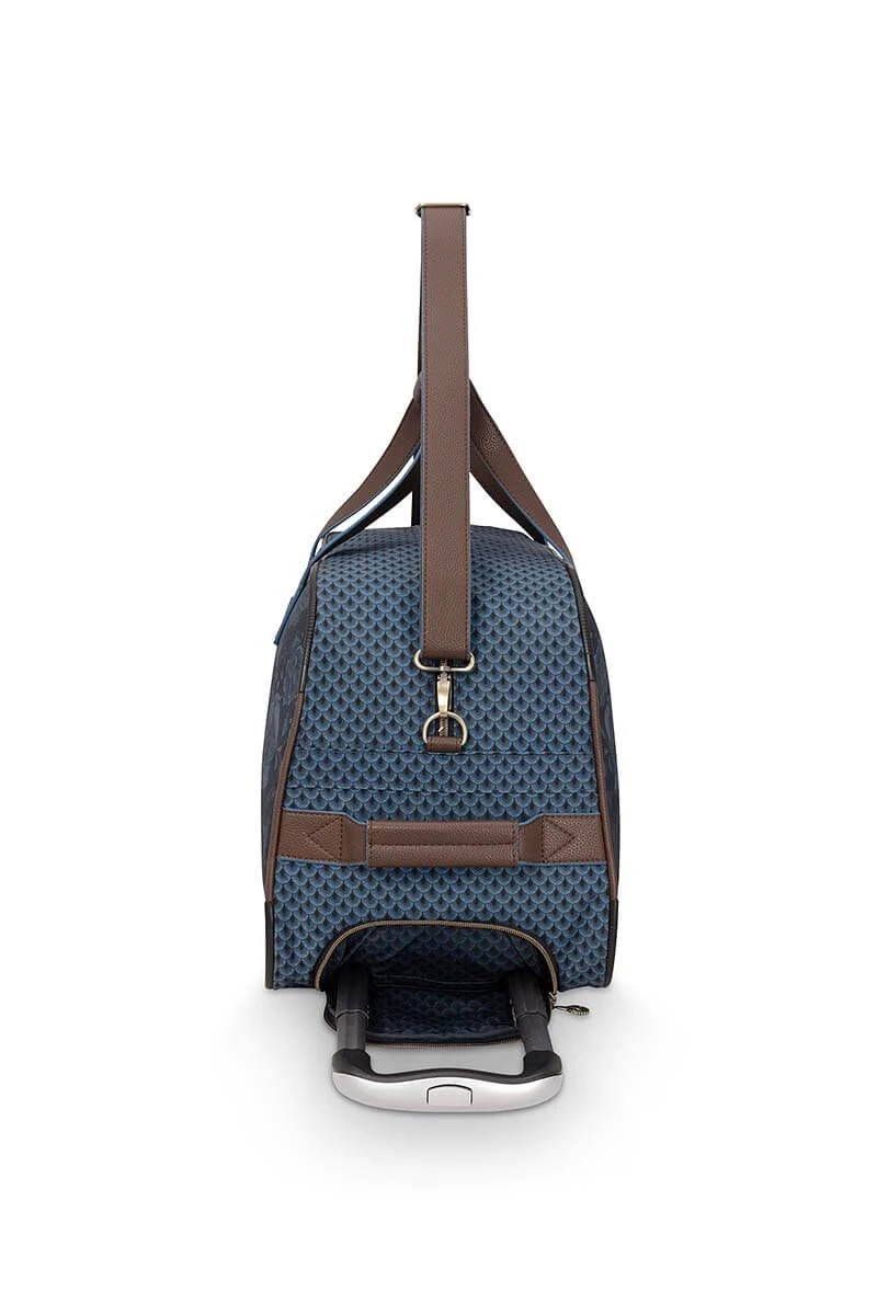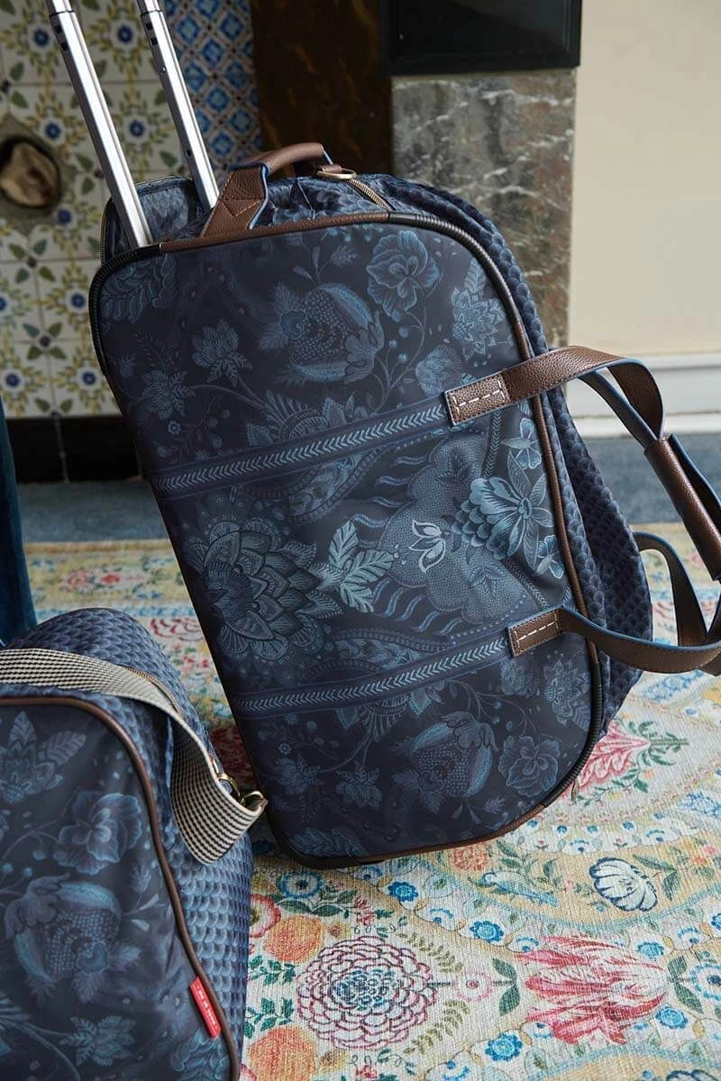 The new weekender on wheels in the color indigo blue with the Kyoto Fesitval design is a great addition to your wardrobe. This weekender has one large storage compartment for your clothes and shoes, in which you will find 3 side pockets. One with a zipper and two with an elastic band. The outer and inner material are water repellent, which makes it perfect for any weather forecast. In addition, you can turn the weekender into a weekender on wheels by taking out the handle from the storage compartment.